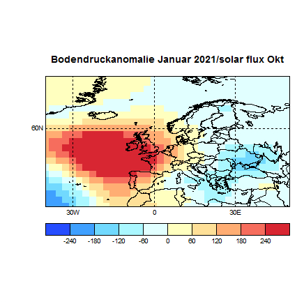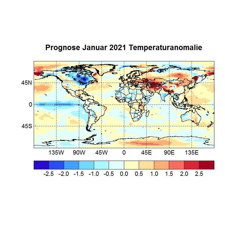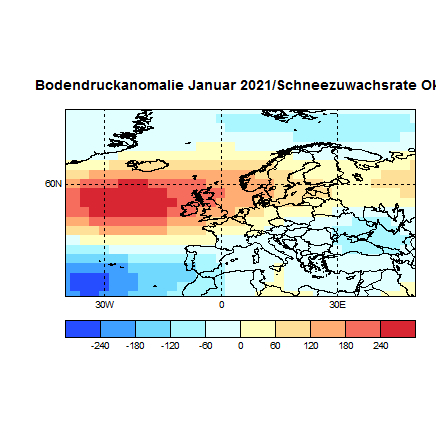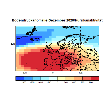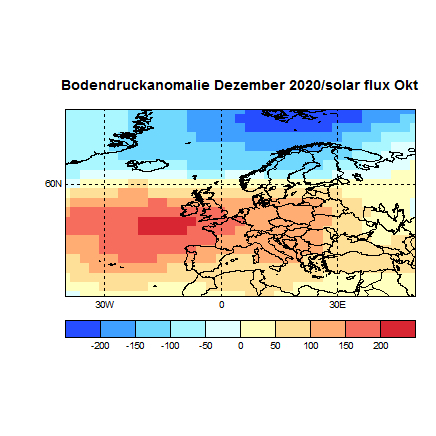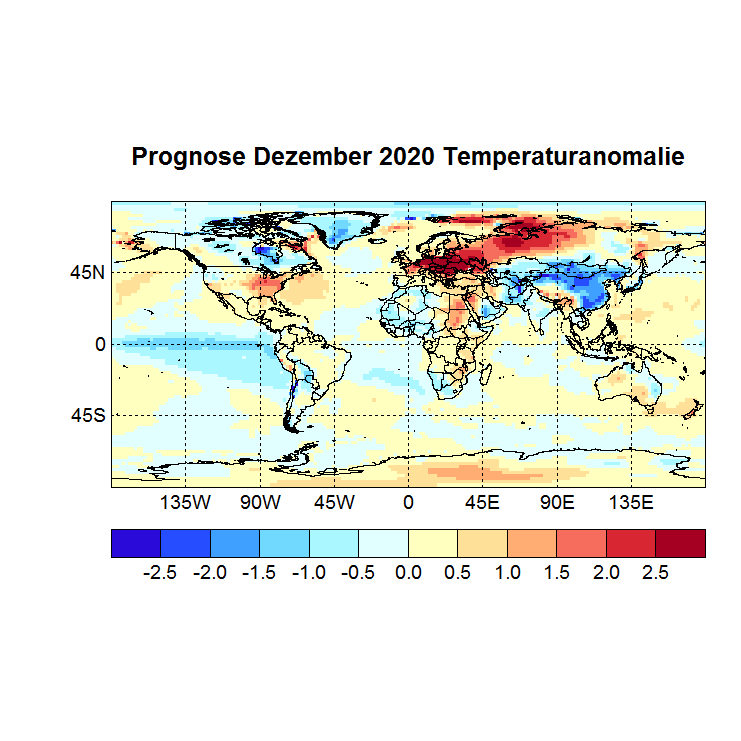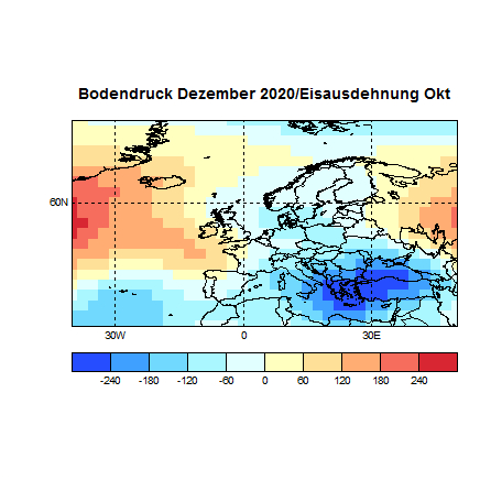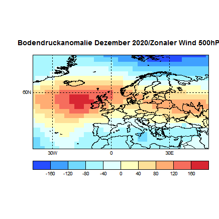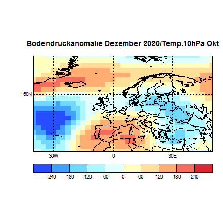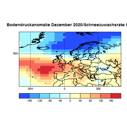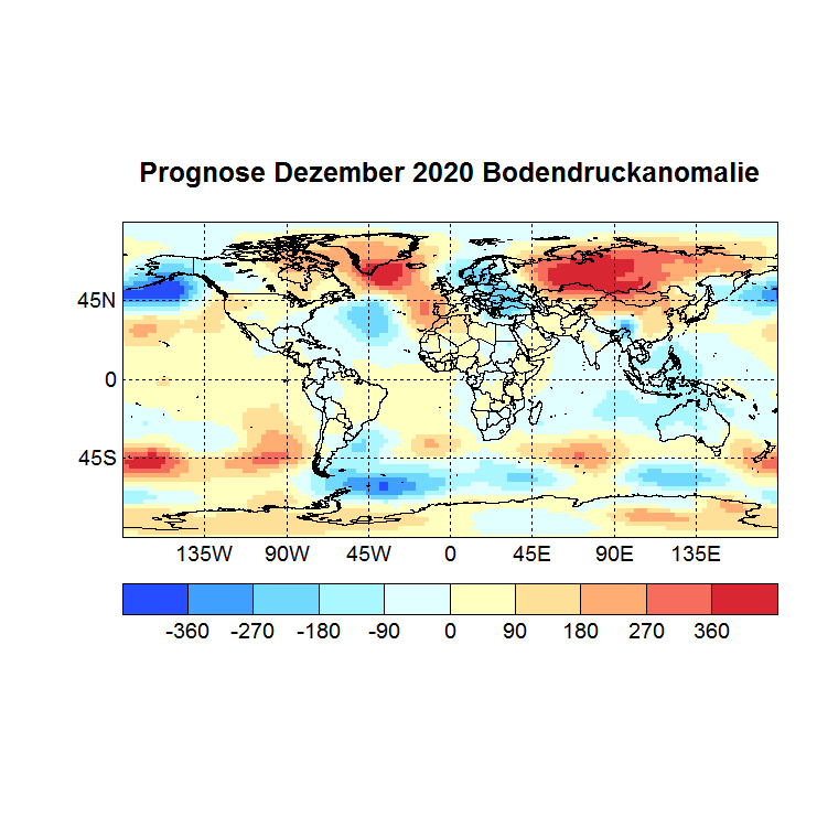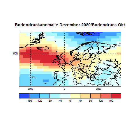 Für die berechnete Bodendruckanomalie des Dezember erscheint mir die prognostizierte Temperaturanomalie für Mittel – und Osteuropa zu hoch, passt nicht so ganz.
