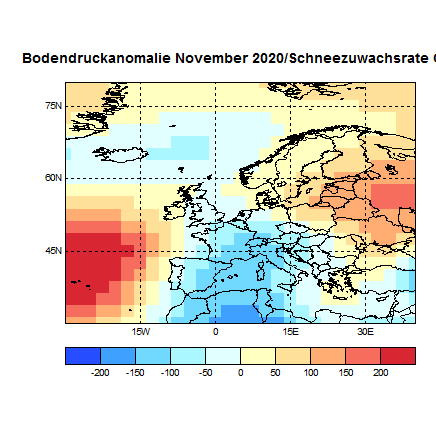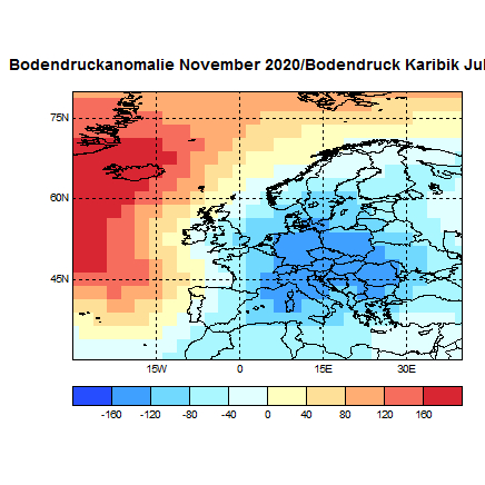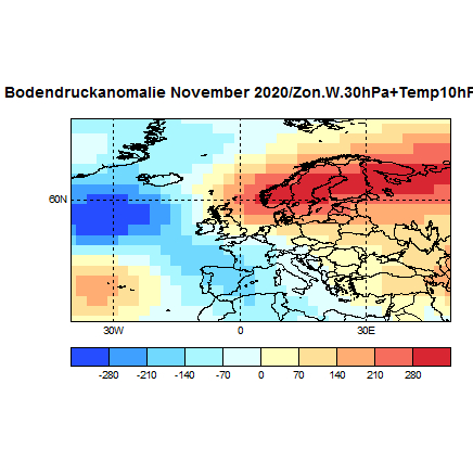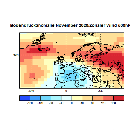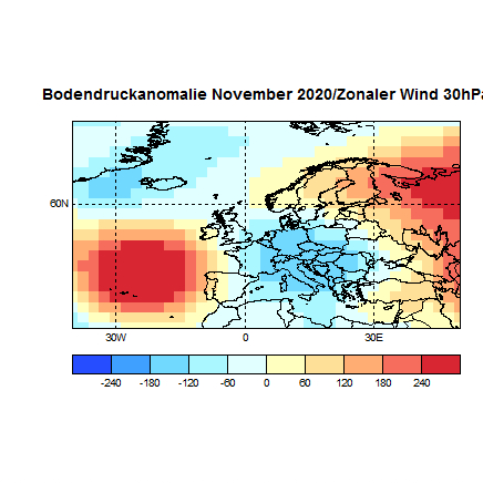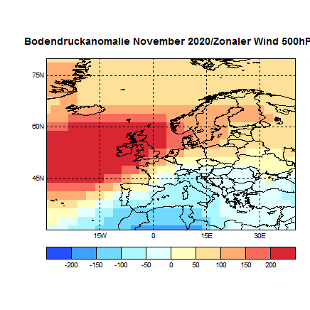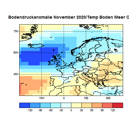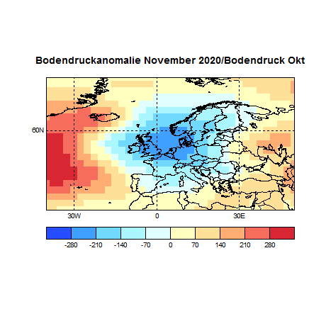 Die Karten zeigen die Bodendruckanomalien des November 2020 für den jeweiligen Faktor im europäisch – atlantischen Raum.