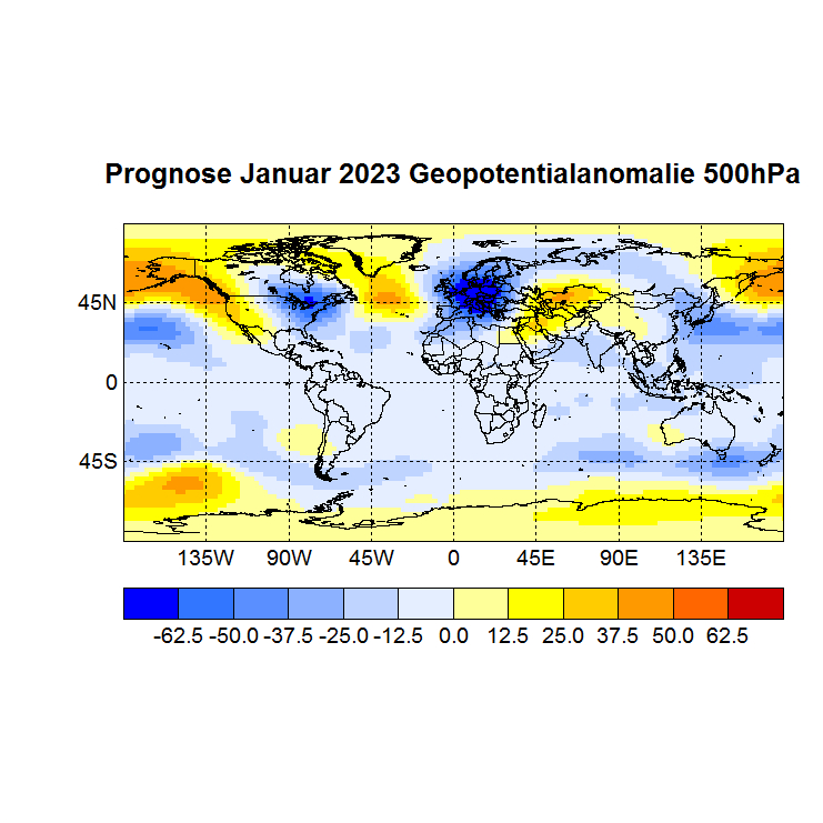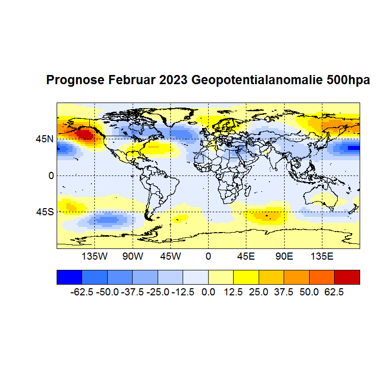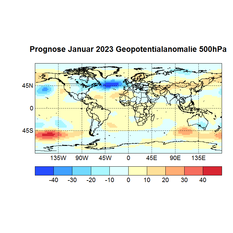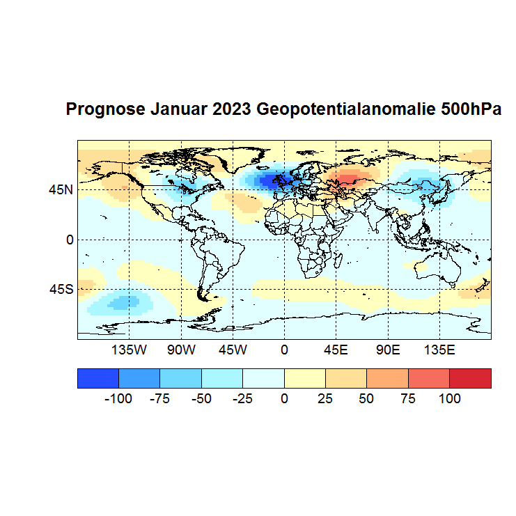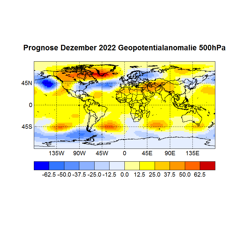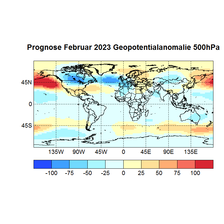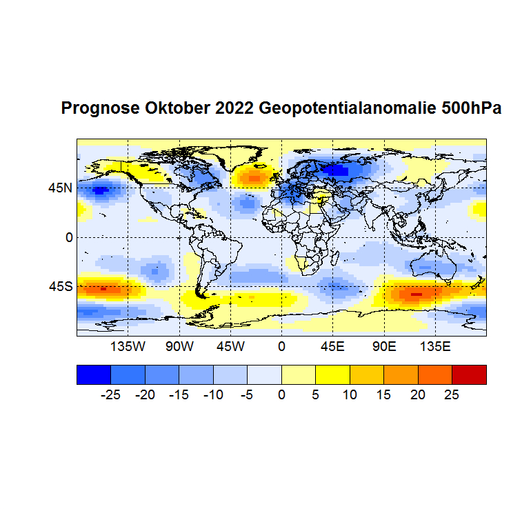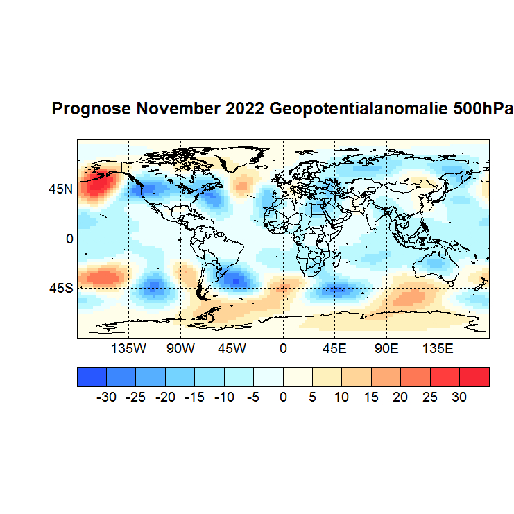 Das Rechenprogramm sucht sich nun die höchsten Korrelationen (Canonical Correlation Analysis) zwischen den Gitterpunkten des Vor – und des Zielmonats und berechnet auf diese Weise den Zielwert eines jeden Gitterpunktes. In einer Skala von -1 bis +1 werden dann die zu erwartenden Abweichungen dargestellt, Referenzzeitraum ist 1981 – 2010.
