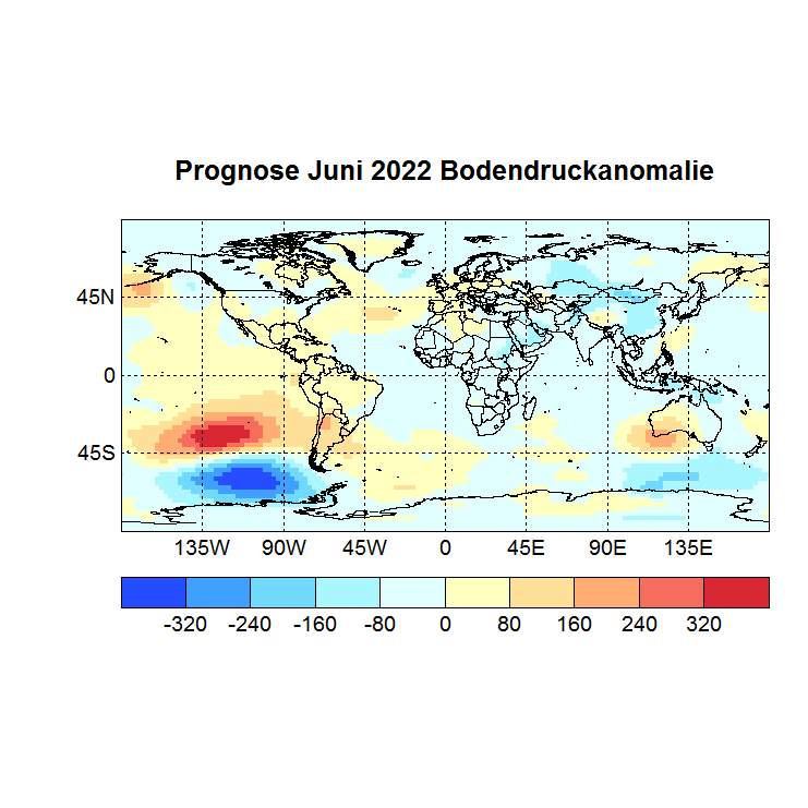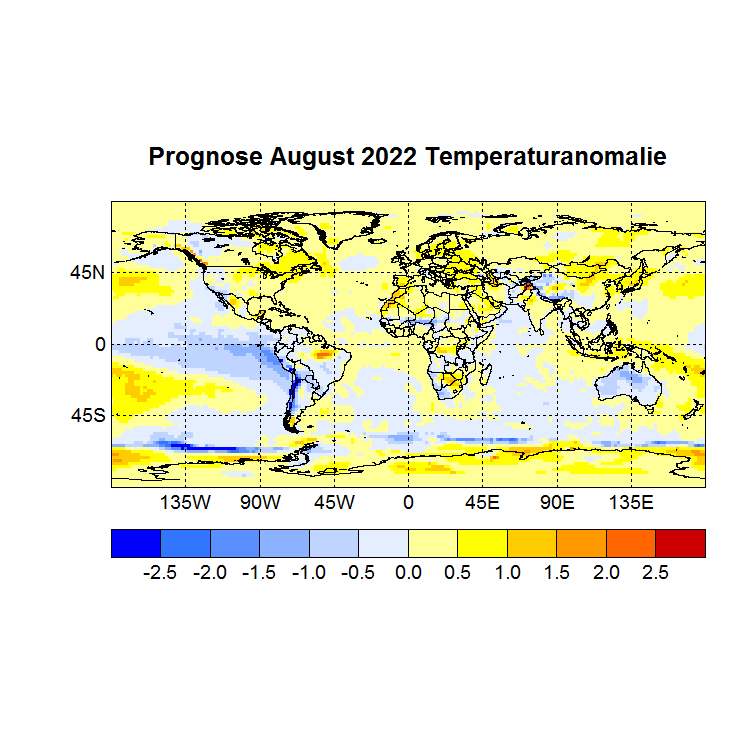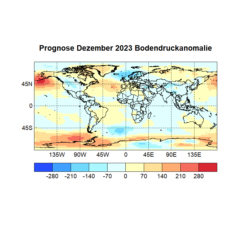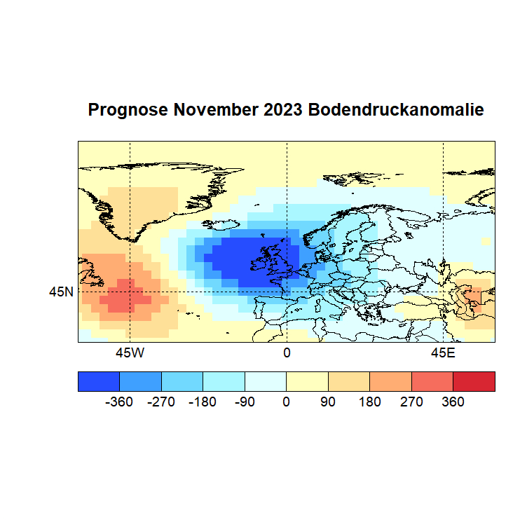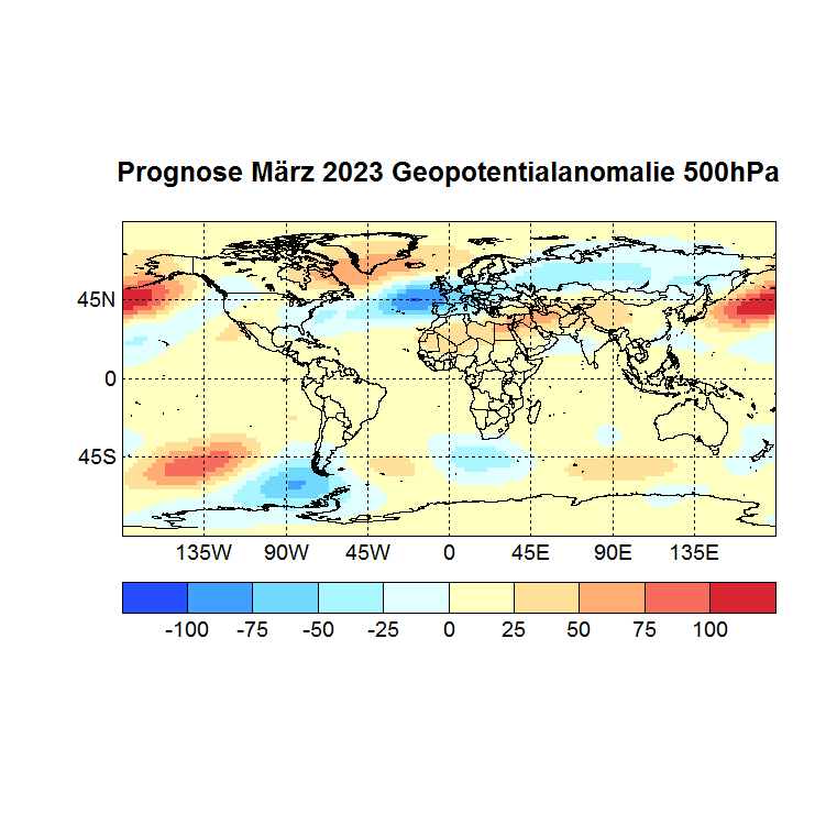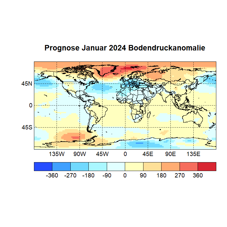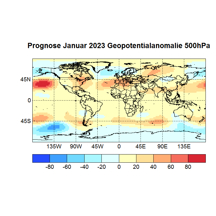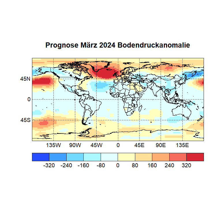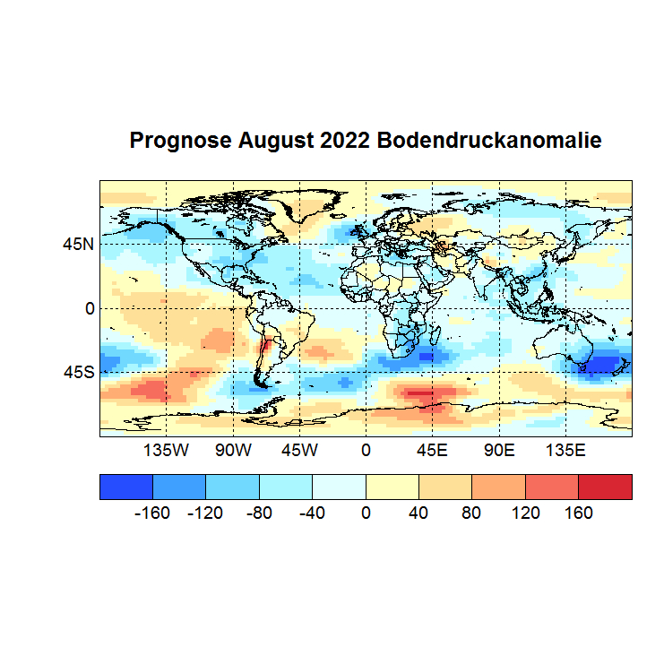 Das Rechenprogramm sucht sich nun die höchsten Korrelationen (Canonical Correlation Analysis) zwischen den Gitterpunkten des Vor – und des Zielmonats und berechnet auf diese Weise den Zielwert eines jeden Gitterpunktes. In einer Skala von -1 bis +1 werden dann die zu erwartenden Abweichungen dargestellt, Referenzzeitraum ist 1981 – 2010.