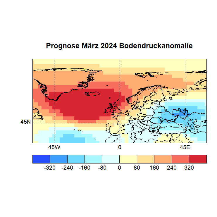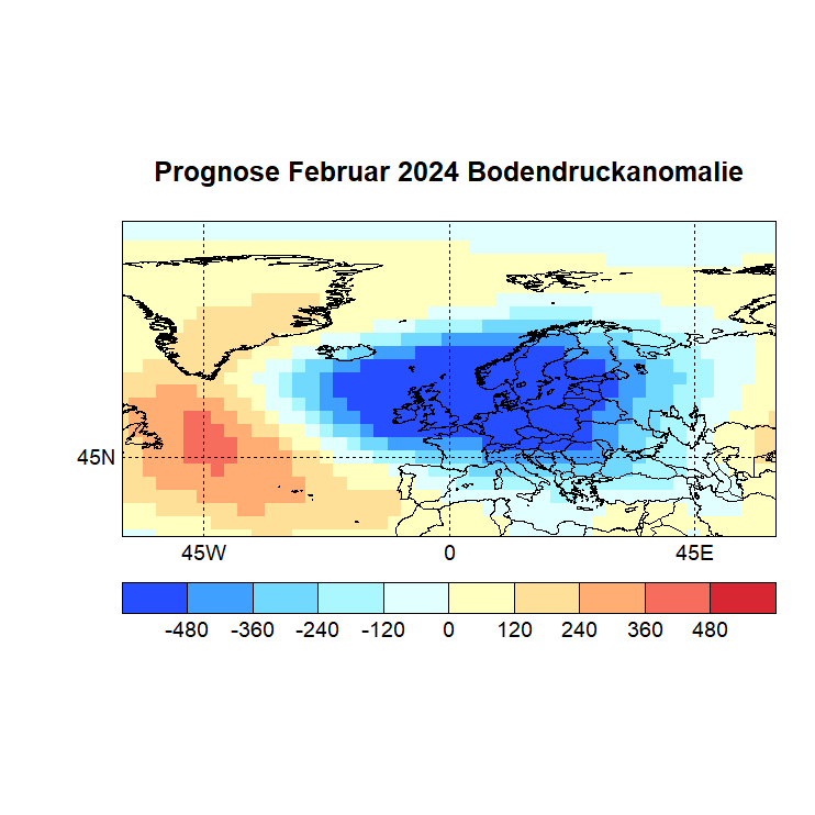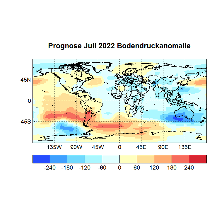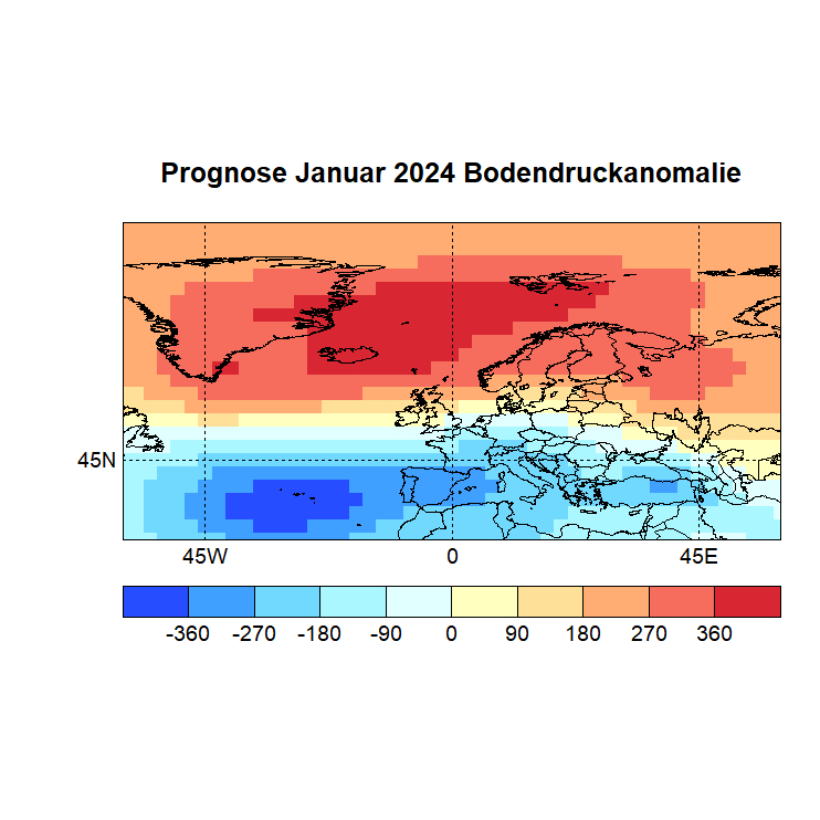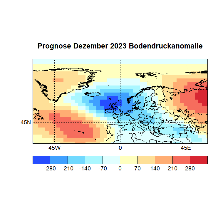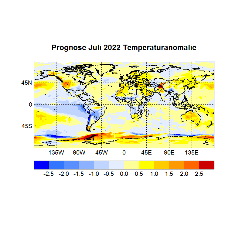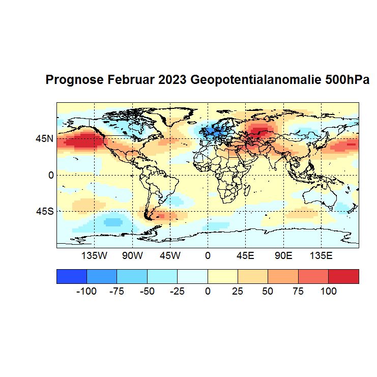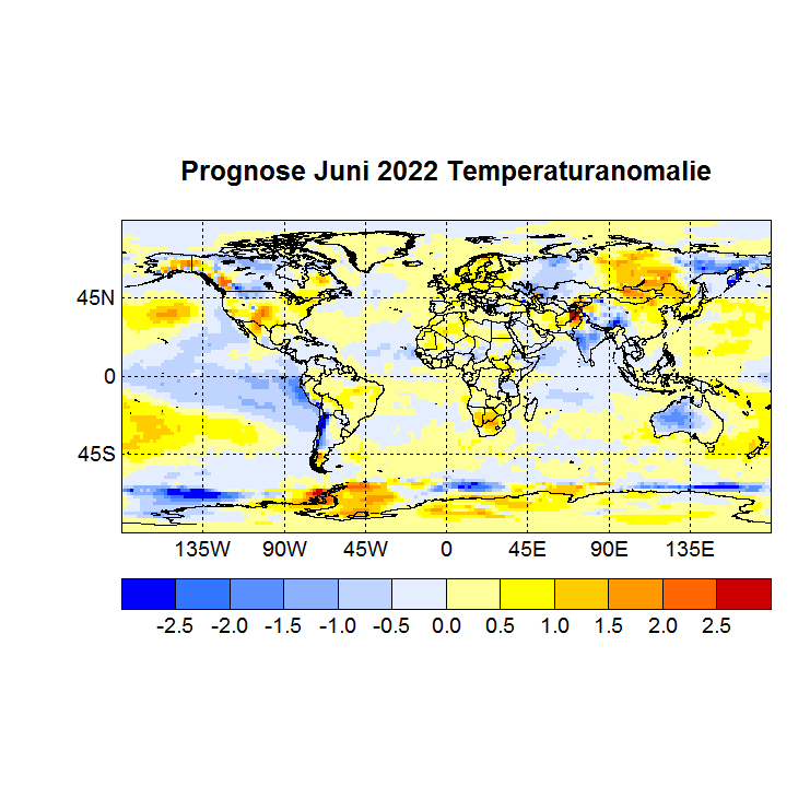 Das Rechenprogramm sucht sich nun die höchsten Korrelationen (Canonical Correlation Analysis) zwischen den Gitterpunkten des Vor – und des Zielmonats und berechnet auf diese Weise den Zielwert eines jeden Gitterpunktes. In einer Skala von -1 bis +1 werden dann die zu erwartenden Abweichungen dargestellt, Referenzzeitraum ist 1981 – 2010.