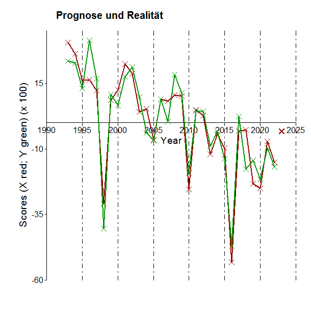 die Prognosemethode habe ich etwas verändert. Um mehr Datenreihen verwenden zu können, musste ich allerdings den Analysezeitraum verkürzen, weil sonst die Rechenkapazität nicht reichen würde, also nur 1993 bis 2022, 4 Datenreihen, insgesamt 47.000 Gitterpunkte global.